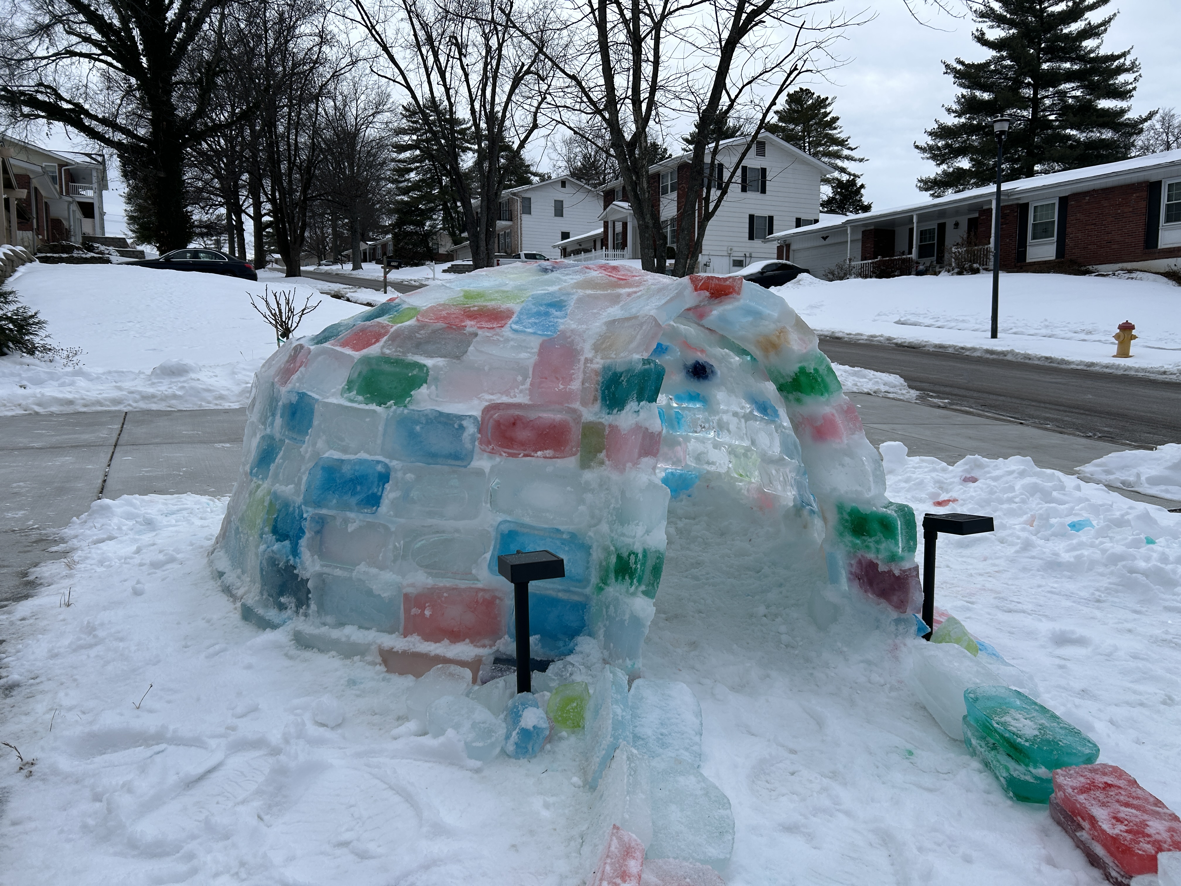 She saw these people on TikTok or Xiaohongshu building ice igloos in their yard by making ice bricks—with food coloring, a nice touch—in aluminum bread pans. That's it. Make ice bricks, stack them in the right shape, and hey presto, you've got a place to shelter from the storm.